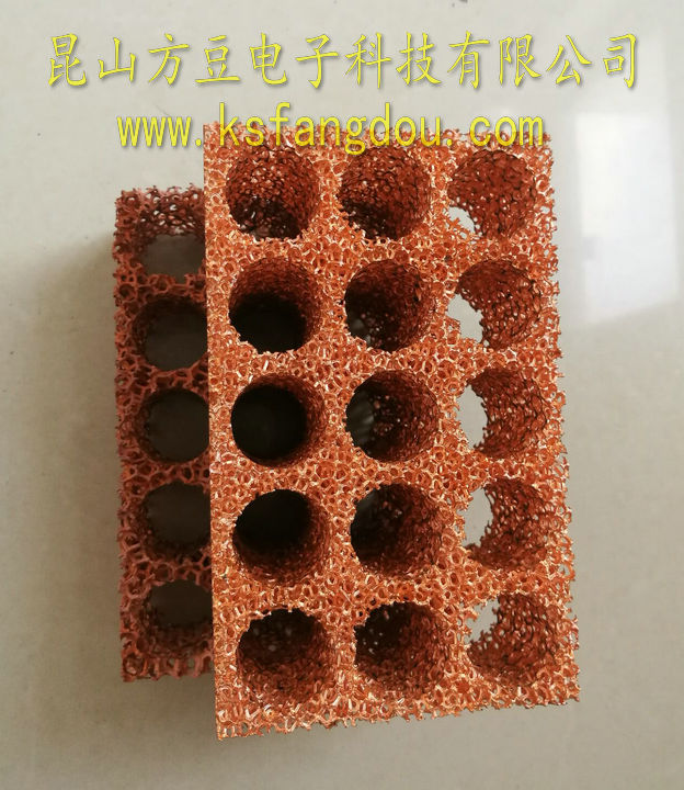 (3)导热材料。泡沫铜具有优良的导热性能,使其成为性能优异的阻燃材料,在国外许多先进的消防器材上获得应用,尤其是作为火焰隔离器材具有优异的效果;另外,人们利用泡沫铜优良的导热性能及表观通透性,制作成电机、电器的散热材料。